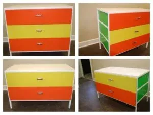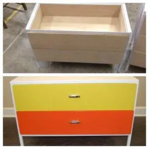 We started by stripping the white paint off the drawers and sanding them very well. Next, we moved to prepping the 11 drawers for painting. Only painters can appreciate the amount of prep work that goes into painting pieces correctly. It’s far from taking a piece of furniture and spraying it, and calling it a day. In this case, the customer wanted each drawer to be multi-colored. That required more prep work than just about any paint job we’ve done. Each drawer had to be taped in such a way that the lines were clean and even. She elected that all the sides would be green and the drawer fronts would rotate between orange and citron. The result made our customer ecstatic because she’s a Mid-Century Modern purist.