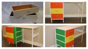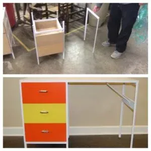 The customer’s pieces consisted of three dressers and desk. All the wooden drawers fit into metal frames. Because all the drawers were visible, they would serve as the focal point of all the pieces. Previous Herman Miller designs featured multi-colored drawers, so the customer wanted to repeat that theme.