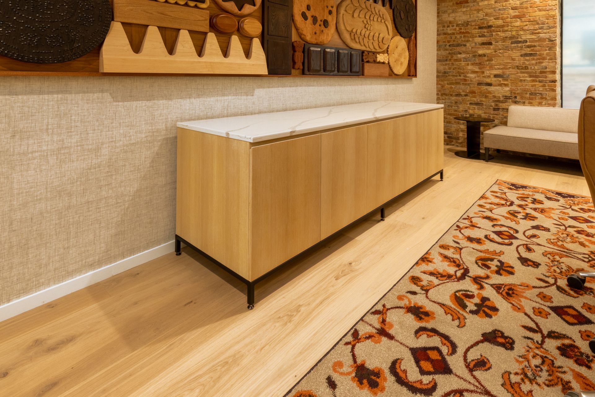 In addition to the 45 tables, we also built and installed four wood-veneer credenzas. The terrazzo top credenza pictured was perfectly matched to existing tables for color and wood species, with a walnut veneer.